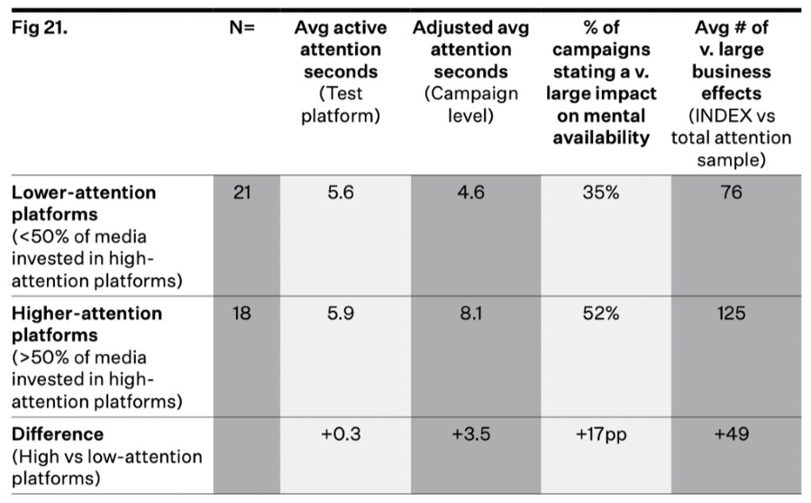 Finally, and notably, the report also found that similar creative content achieved significantly more attention and better business outcomes on high attention platforms. These findings reinforce the importance of media choice in achieving effective advertising outcomes.