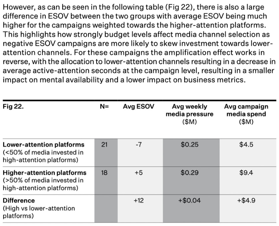 The evidence presented by Peter Field and Rob Brittain in their recent publication on WARC is also meaty proof. They retrofitted attention curves to the media plans of Australian Effies Awards entrants and found that campaigns that primarily ran on higher attention platforms reported a 65% increase in very large business effects such as profitability and customer acquisition. They also found that focusing on attentive reach is critical regardless of absolute budget size and ESOV. They found that lower budget/lower ESOV campaigns tend to skew their investment towards lower attention channels (as per Fig. 3), using the cheaper CPMs to prop up impression volumes. Whilst this is well intentioned, it’s damaging to campaign effectiveness because whilst the CPMs are lower, effectiveness per impression is lower still. The outcome is the campaign is less effective than it should be, further compounding the impact of a lower budget. Ultimately this is the opposite of what some of the cases have done above who have recognised that higher CPMs with fewer impressions is better for the bottom line.